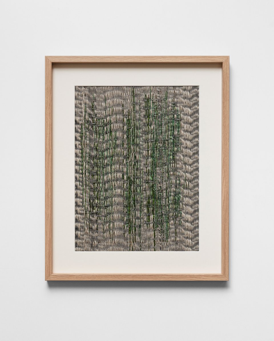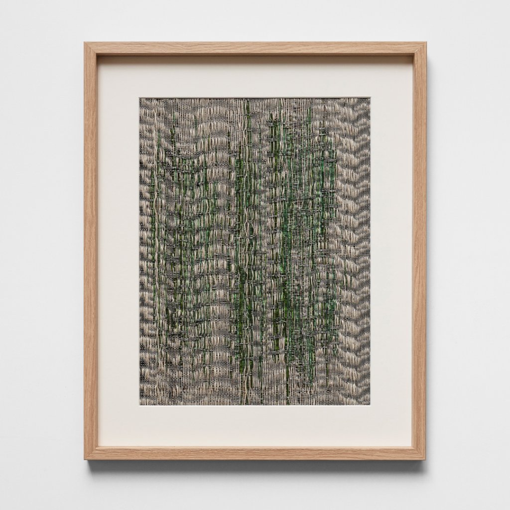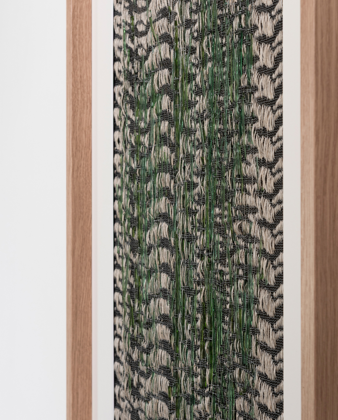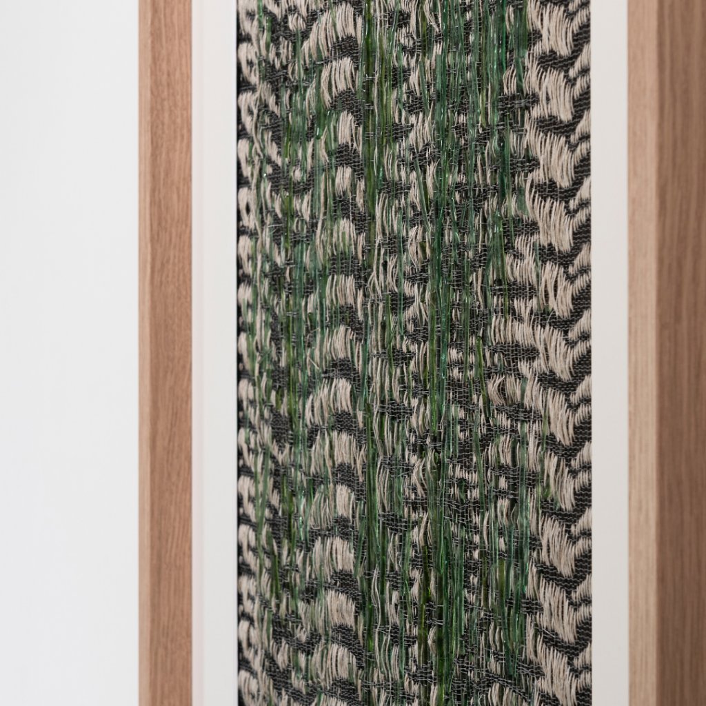 Pièce unique, Verre de le Rance filé au chalumeau, chiné de lin & chanvre, Tissage sur métier à tisser, 2024, 40x50cm encadré