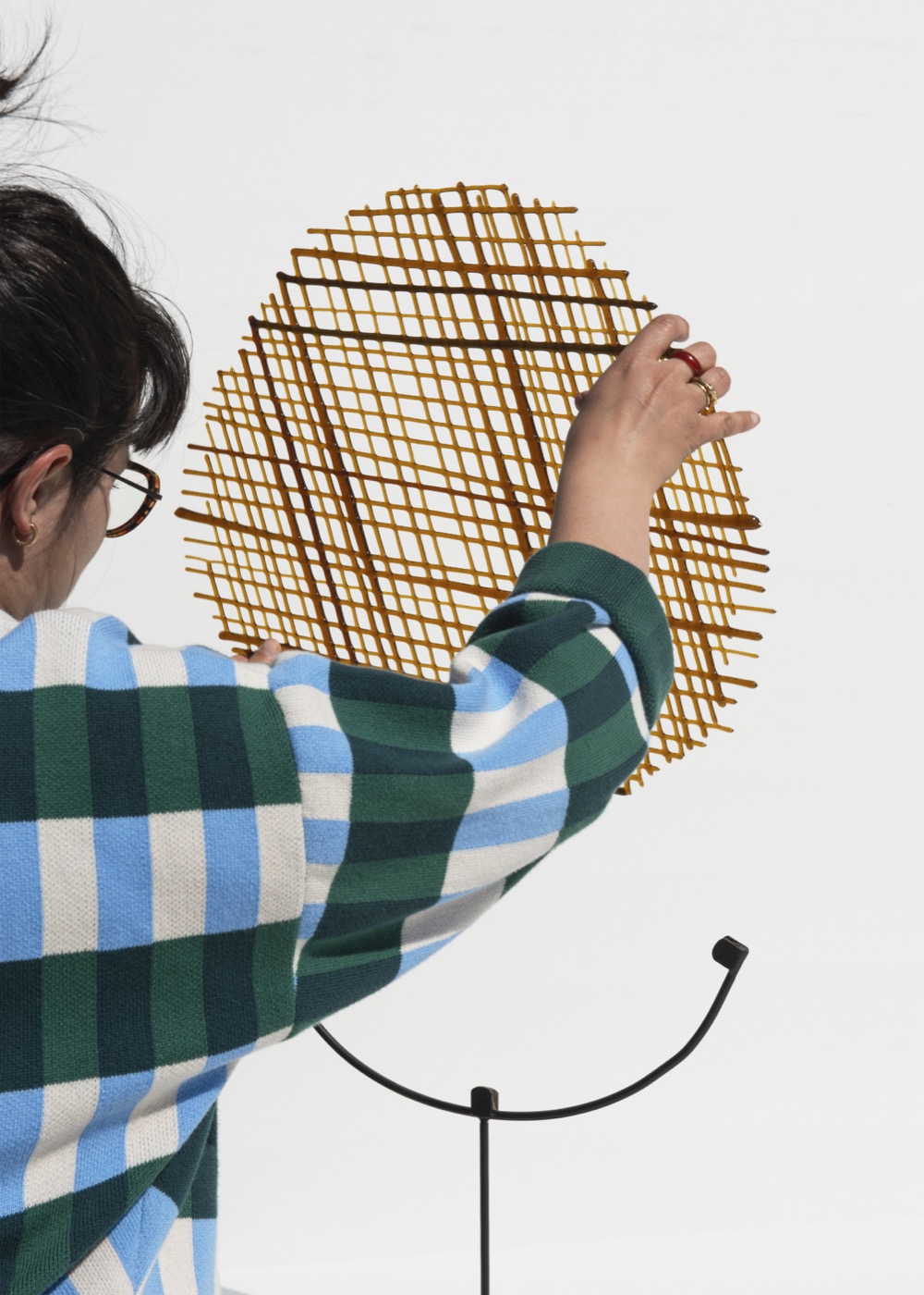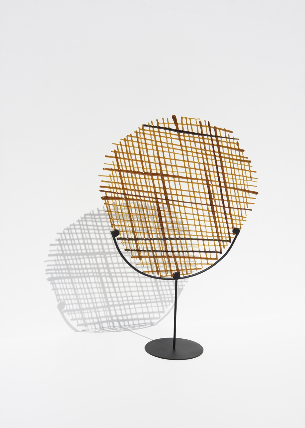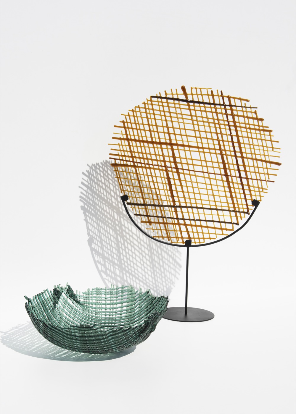 Influencée par ses travaux en cours sur les exosquelettes de diatomées, Lucile Viaud développe sa technique de maille de verre à partir de baguettes préalablement étirées à chaud.
