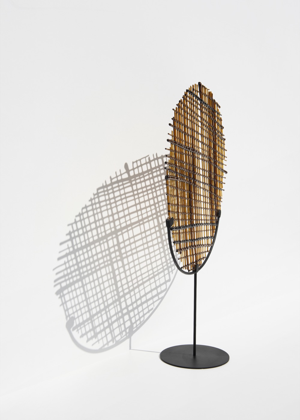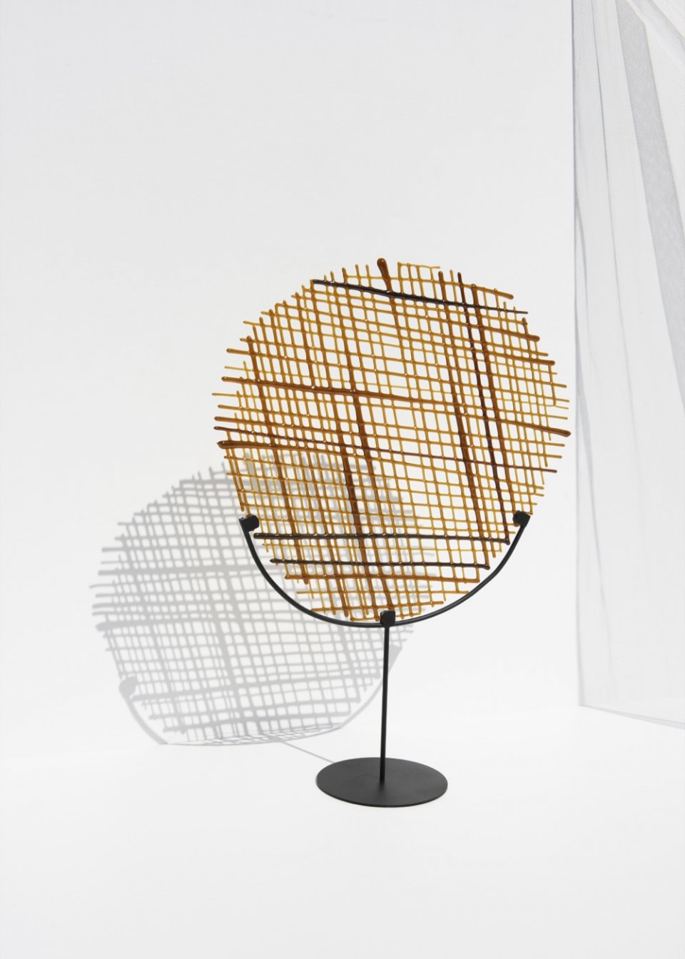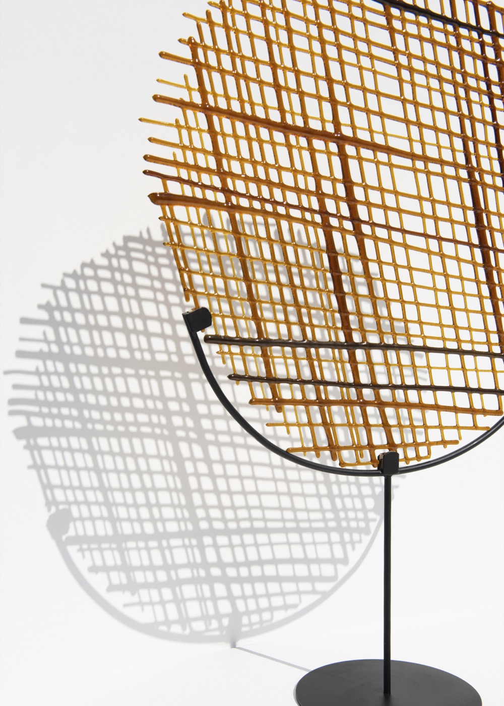 La maille est réalisée avec la technique du fusing. La composition de sa structure tramée est réalisée à partir de baguettes de verre préalablement étirées à chaud.