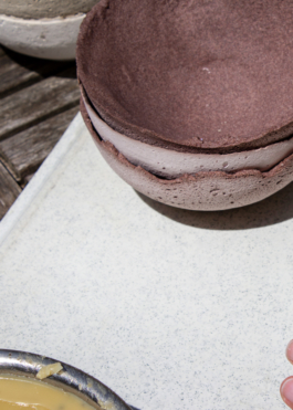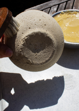 Mises en forme par moulage à l’Atelier, des pièces Ostraco sont produites ponctuellement en micro-série et viennent compléter les gammes en verre. Non-alimentaire, le plâtre de mer est protégé par un apprêt issus du recyclage d’une cire de corps confiée par un apiculteur de la vallée du Léguer (22).