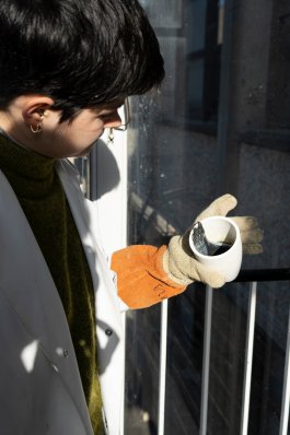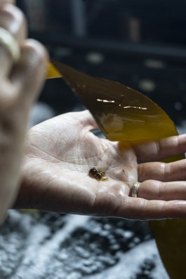 Grâce au soutien de l’association Savoir-Faire des Îles du Ponant, elle formule un verre inter-îles à partir de ressources à valoriser dans différentes filières implantées, pour faire naître des applications en collaboration avec les savoir-faire présents sur chaque île. Composé de sable d'excavation issus de la création de logements sociaux sur l'île d'Hoedic, de filtres de plongée d'un scaphandrier Ouessantin (Scaph Eusa) et de cendres de fumaisons de poisson (Conserverie de l'île d'Yeu, Fumaisons de l'île de Groix et Groix&Nature), le nouveau verre des îles du Ponant nous ramène les pieds sur terre et arbore une couleur cuivrée puissante.